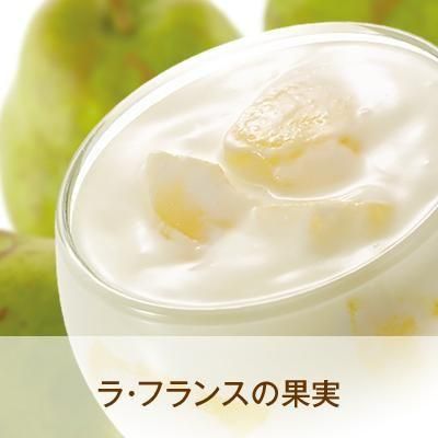 「ラ・フランスの果実入り」とろけるような食感の果実を丁寧にひとつひとつ皮をむいてカットし、なめらかなヨーグルトに合わせました。香り高いラ・フランスはヨーグルトの爽やかな酸味と相性抜群です。