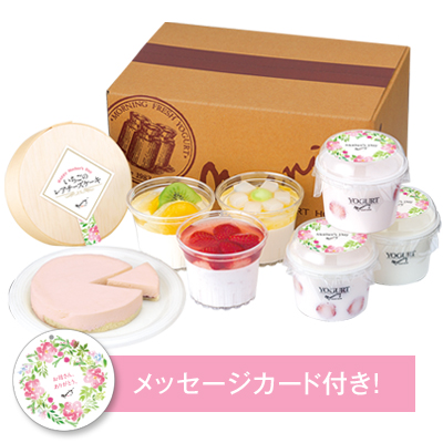 まるごといちごヨーグルト3個と、ざく切りの果実がたっぷり入った「アロエ」、セミドライマンゴーを加えた濃厚な味わいの「マンゴー」、抹茶と甘く煮たあずきを組み合わせ和の味わいに仕上げた「抹茶とあずき」を詰め合わせました。