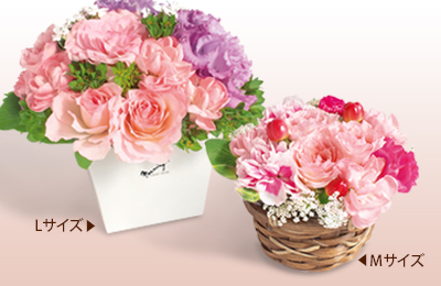 フラワーアレンジメントは、かわいらしいカゴやボックスに入っておりますので花瓶などに移し替えることなくそのまま飾ることができます。お届けから約7~10日間程度お楽しみ頂けます。Mサイズはカーネーションをメインにやさしいピンク色で可愛らしい雰囲気に仕上げ、Lサイズはスタンダードなピンクとパープルを基調に上品にまとめています。