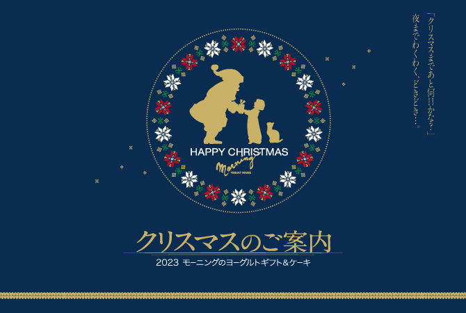 「クリスマスまであと何日かな?」待つ時間もわくわく、どきどき・・・。今年もモーニングから聖なる夜にふさわしいクリスマス限定ヨーグルトギフトをご用意しました。今年はクリスマスギフト限定のパッケージデザインも新たな装いに。大人な雰囲気の色合いに温もりを感じるノルディック柄を使ったデザインになりました!家族みんなでハッピーな時間をお過ごしください。