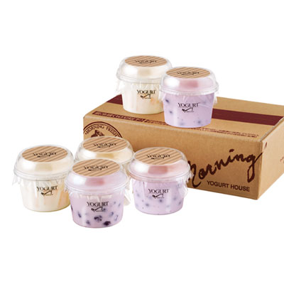 「桃の果実入りヨーグルト」と「ブルーベリーの果実入りヨーグルト」を3個ずつ詰合せました。モーニングの夏の定番をぜひご堪能ください。夏のご挨拶にもおすすめのセットです!