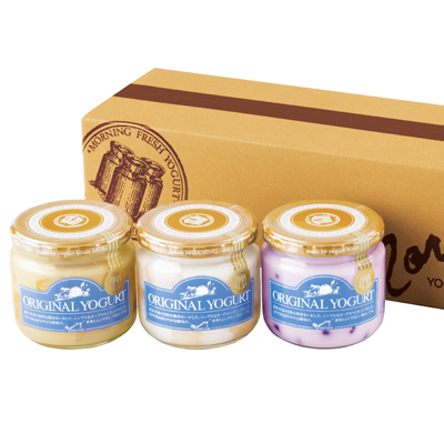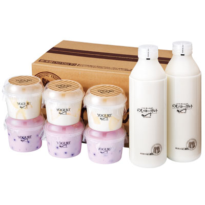 「桃の果実入りヨーグルト」と「ブルーベリーの果実入りヨーグルト」を3個ずつとマイルドな口あたりですっきりとした味わいが男性にも人気な「のむヨーグルト」を2本詰合せました。