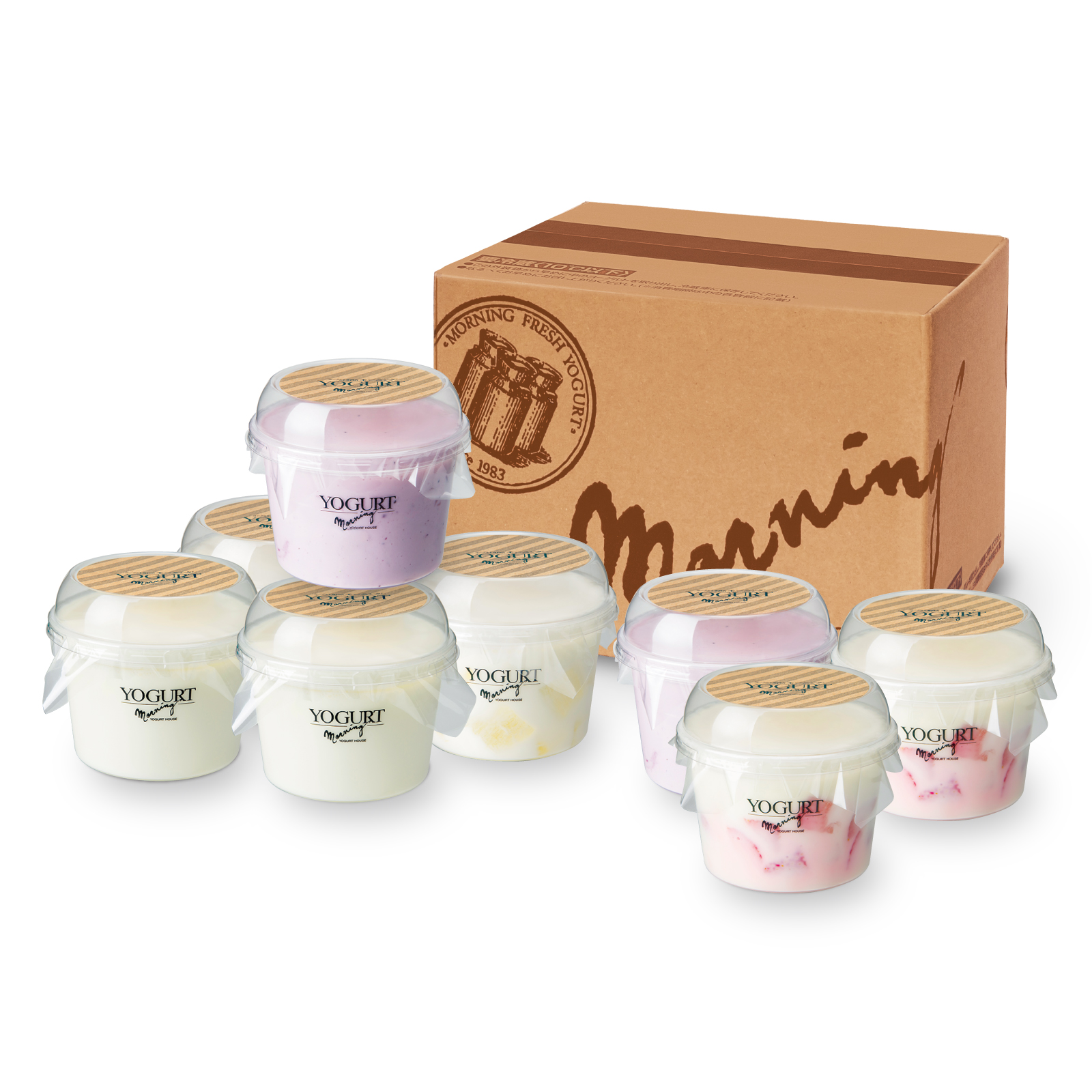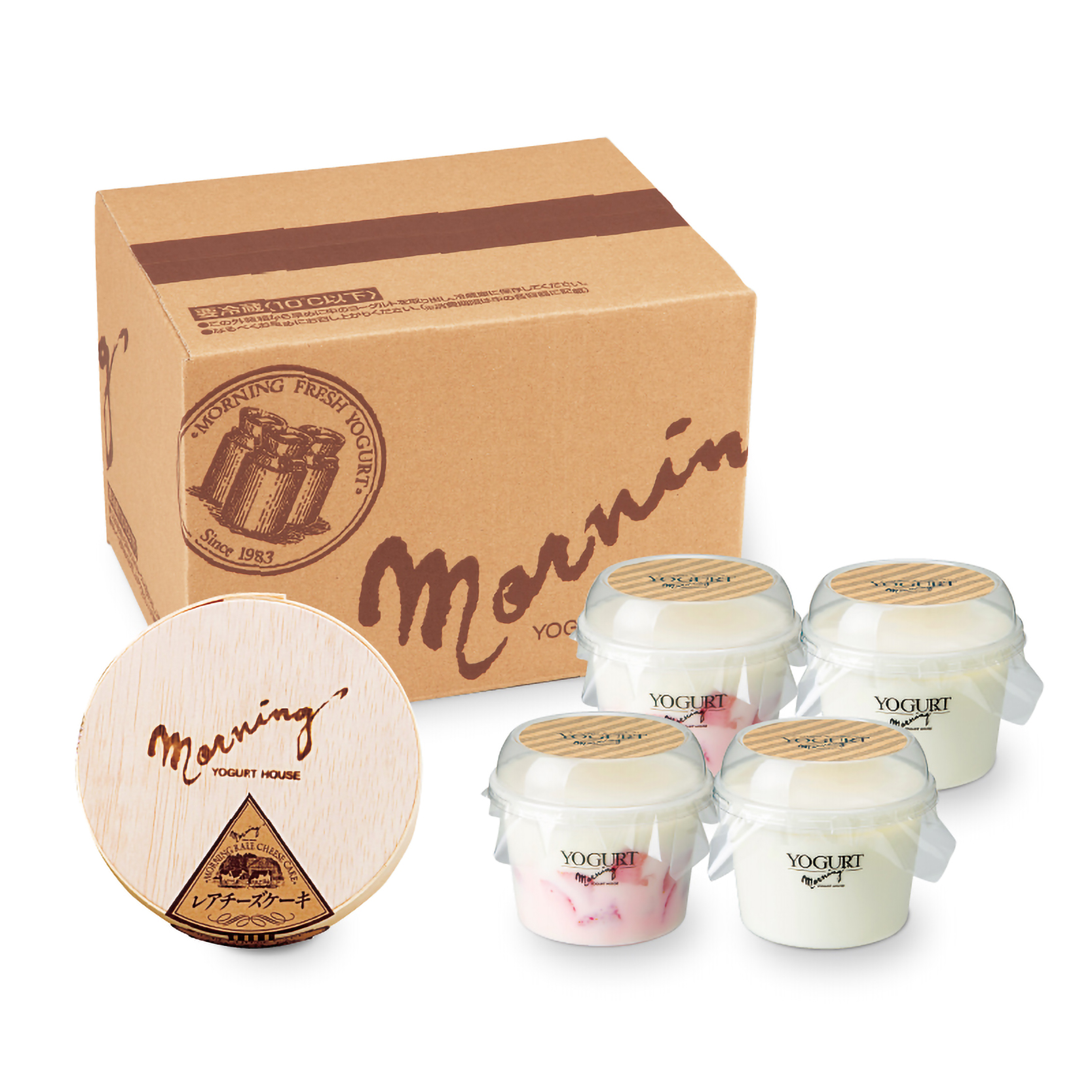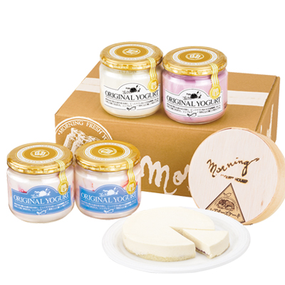 モーニングで一番人気の「いちごの果実入り」と親しみやすい味わいのオリジナルヨーグルト2種、クリーミーでコクのある味わいの「レアチーズケーキ」を詰合せました。