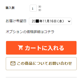 例)「お届け期間:20〇〇.11.16~12.20」は、11月16日~12月20日間でのお届け指定、11月11日以降に申し込みの場合は「出荷日目安」の通りに最短日~12月20日間でのお届け指定です。